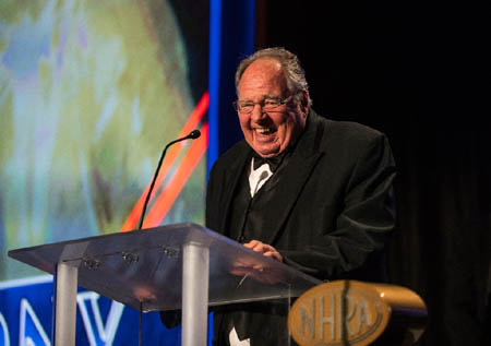 Kalitta's honor received the first standing ovation of the evening as NHRA President Peter Clifford addressed the crowd with some of Kalitta's incredible achievements. A video tribute followed with all four of Kalitta's current full-time drivers: Alexis DeJoria, Doug Kalitta, J.R. Todd and Del Worsham, team Vice-President of Operations Jim Oberhofer, NHRA legends Don Prudhomme and Tom McEwen, and rival team owners John Force and Don Schumacher speaking on what Kalitta meant to the sport and how far reaching his impact has truly been. Escorted to the stage by Oberhofer, nephew Doug Kalitta and grandson Corey Kalitta, son of the late Scott Kalitta, Connie Kalitta received his one-of-a-kind trophy and made remarks. "I am not usually at a loss for words," said Kalitta. "Thank you for this. I appreciate everything that each of you said in that piece. I am honored to receive such an award." Kalitta, known as "The Bounty Hunter" as a driver, was the first racer to reach the 200 mph mark at an NHRA sanctioned event. He was inducted into the Motorsports Hall of Fame of America in 1992 and won the U.S. Nationals in 1994. On NHRA's 50th anniversary in 2001, he was named one of the NHRA's Top 50 Drivers. His team, Kalitta Motorsports, ended 2016 with their most successful season on record as Team Kalitta's four full-time teams earned a combined 131 round wins. Kalitta will continue to have a major part of the NHRA for many years to come as his team expands to six entries beginning in the 2017 season with rookie driver Troy Coughlin Jr. and veteran Paul Lee joining Team Kalitta on a part-time basis to compete alongside DeJoria, Kalitta, Todd and Worsham.