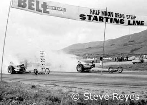 In the last segment on dragstrips, we featured the Fremont and Sears Point dragstrips. A big contrast from the newly opened Sears Point operation was the former airport turned dragstrip located in Half Moon Bay, California. This race track/airport runway was just south of San Francisco along the coastal highway, just a stone's throw from the Pacific Ocean. When I went there, the place was run by the owners of Champion Speed Shop based in San Francisco. They raced off and on at HMB with about two or three big shows a year. As the track was an old runway, it was not the smoothest racing surface. Also, the quicker and faster the top fuel dragsters ran, the shorter the stopping area became at Half Moon Bay. If a faster race car had a chute fail to deploy, they were in serious trouble. For example, Bob Haines almost drowned in a culvert full of water at the end of the track while at the controls of the M&R Special AA/FD. Denny Milani wasn't as lucky as Haines. A chute failure and Milani took the Gotelli/Milani AA/FD off the side of the shut-down area into a culvert and he died instantly in the ensuing crash. Another airport runway converted into a race track was Kingdon raceway in Lodi, California. Kingdon was a wide-open race track with the whole area paved. Since the entire area was paved, there were no trees, hence no shade. In the summer with the temperature rising to 100 degrees plus, any shade was a gift or man-made. I photographed in the winter (January 1st) and in the summer at Kingdon. This one track had the lowest temperature (37 °) and the highest (120 °) The final track in this segment was located on the outskirts of California's capitol city of Sacramento. I first attended the races at Sacramento Raceway in 1965. I believe the event was called The California Championships and it featured many a well-known name in NorCal and SoCal top fuel racing. When I became NHRA's Division 7 photographer, Sacramento was a regular stop for me. The track surface seemed okay but the pit area and spectator areas were dusty and dirty from a lack of paving. They would use a large water truck spraying water to keep the dust down. Over the years, the track has undergone vast improvements and still operates regularly to this day. If you wish to purchase prints of the photos below or any others, they may be obtained by contacting us at breyes@reyesontour.com. Other photos for purchase may be viewed by following the links at www.reyesontour.com.