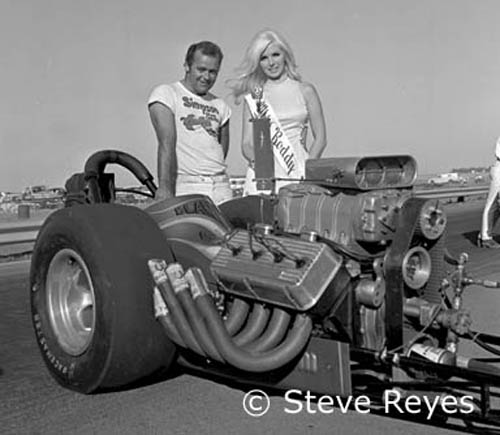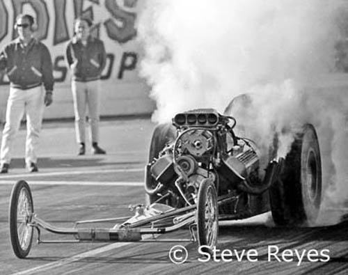 Continuing our short profiles of Northern California top fuel racers, we continue the story of Shorty Leventon who had lost his ride due to some poor choices and Gary Ormsby leaving him in the dust. I cannot remember a time when I didn't see him driving a top fuel dragster on the NorCal racing scene (I wasn't at the race Ormsby replaced him). Some of the cars I know he drove where the following: The Vagabond, The Renegade AA/FD, The Cheetah AA/FD, Wulf and Maher AA/FD, Wulf and Loy AA/FD, Wulf, Semus and Leventon AA/FD, B&N Automotive AA/FD, and I know there were more but some were just a weekend ride for Mr. "I drive everybody's AA/FD." The resident craftsman in Sacramento racing world was John Shoemaker. Shoemaker not only could build you a complete race car but he drove and maintained his own AA/FD. He was a racing fixture in the area for years. Another craftsman in the area was long time owner of B&N Automotive, Noel Black. Black was a semi-regular top fuel racer because of business commitments. He had to leave his AA/FD parked many weekends to attend to other business. In 1968, he built a rather strange twin engine car, one engine in front of the driver and the other engine way out over the front wheels. The car was dubbed "The Rhinoceros." Noel made a few quarter-mile passes and then fitted the car with a streamliner body and went to Bonneville. I was at Bonneville in 1969 and did photos for Noel. He had taped strands of wool on the car's body and wanted to see how the air flowed over the car at speed. I guess you could say it was a poor man's wind tunnel test. Then in 1970, he went back to Bonneville for speed trials. A blown rear tire flew into the driver's cockpit at 300 mph and fatally injured Noel. It was very sad as he was a great guy. Finally, Tom Blankenship was another part time top fuel racer from the Sacramento area. I saw him at Fresno and Sacramento a few times in the late 1960s and 1970. I was told he ate his way out of his AA/FD and couldn't it in it anymore but no one has ever confirmed that. Stay tuned for more interesting remembrances of top fuel racers of God's country, Northern California. If you wish to purchase prints of the photos below or any others, they may be obtained by contacting us at breyes@reyesontour.com. Other photos for purchase may be viewed by following the links at www.reyesontour.com.