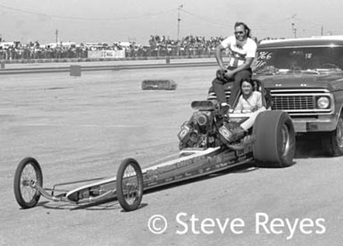 ownership and driving of the Speed City Hustler Jr. A/FD in 1965. The color photo has Martinez standing by the push car door as Uyehara left the starting line. The black and white photo has Uyehara kneeling, watching Martinez leave the starting line with the front wheels high in the air.
