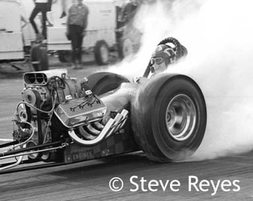 Since I have mentioned The Wailer AA/FD in both parts eight and nine, I guess maybe I should share some information on this NorCal top fuel team and share photos of that infamous crash. The first time I saw The Wailer AA/FD race, was in 1965. The team was Hay, Haslum and Walsh with Tommy Walsh at the controls. It was in late 1966 or early 1967 when a new Lefty Hay built Wailer was debuted at Fremont with Frank Martinez at the wheel. The team was now Lefty Hay and Tommy Walsh. With Martinez departure in 1968, The Wailer was driver-less until Rich Zoucha got behind the wheel. When Zoucha's other AA/FD ride was parked he drove The Wailer. Dale Emery also drove The Wailer when Rich Guasco's Pure Hell AA/FA was parked. This took The Wailer went from no driver to two part-time drivers. Late in October 1968, at a top fuel final in Fremont, California, Martinez in his own AA/FD faced off with Zoucha driving The Wailer. When the green on the tree flashed, the race was on, down the 1320. Right at the finish line Zoucha's ride pumped about seven quarts of hot oil into the driver's face/cockpit. Unable to see, The Wailer made a hard right and ran over the front of Martinez's AA/FD. Since Fremont had no guard rails and the area was wide open, the two cars tangled and tumbled forever on the Fremont turf. Both cars suffered heavy damage in the crash but both drivers did walk away with a lot of bruises. Frank Martinez was declared the winner as his partner Leroy Jorgenson gathered up what was left of their AA/FD. Hay and Walsh did the same for their wounded Wailer. If you wish to purchase prints of the photos below or any others, they may be obtained by contacting us at breyes@reyesontour.com. Other photos for purchase may be viewed by following the links at www.reyesontour.com.