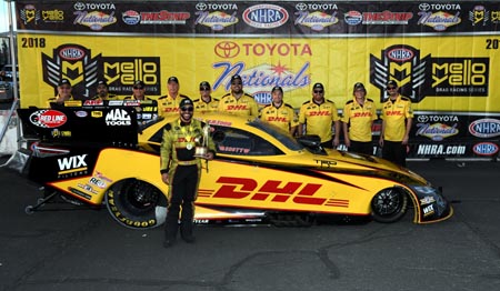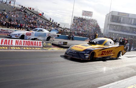 His victory in Vegas - Todd's second in the playoffs - gave him a 74-point lead over defending Funny Car world champion Robert Hight heading into the final race of the season. But with the point-and-a-half system in play for Pomona and up to 191 points on the line to close out the year, Todd knows he still has work to do in his 10,000-horsepower DHL Toyota Camry. "I said earlier this year if we could win four Countdown races we would have a shot at the championship," Todd said. "We haven't won four, but we've gone to four finals and that's what it takes along with getting some help. We were 50 back going into Charlotte and we were thinking we need some help now to make up some ground and we got some. Then to cap it off in Vegas with a win, it was nice to get all the points we could and take that into Pomona. Points and a half will make it interesting. We just need to maintain what we've been doing and go to the later rounds." Brittany Force (Top Fuel), Tommy Johnson Jr. (Funny Car), Bo Butner (Pro Stock) and Andrew Hines (Pro Stock Motorcycle) were last year's winners of the race that will be televised on FOX Sports 1 (FS1), including live finals coverage starting at 4:00 p.m. (ET) on Sunday, Nov. 11. The race is the final event of the year and the Mello Yello Countdown to the Championship, and fans in Pomona are set to see another thoroughly entertaining duel in Funny Car. Hight clinched the world title a year ago at the season-finale in thrilling fashion and will need a spectacular showing this weekend in his Auto Club Chevrolet Camaro SS if he wants to be the first repeat world champion in Funny Car in 16 years. The talented veteran had the early lead after back-to-back playoff wins, including beating Todd in the final round at Dallas, but the past two races have only included one round win, putting the onus on a big performance in Pomona.