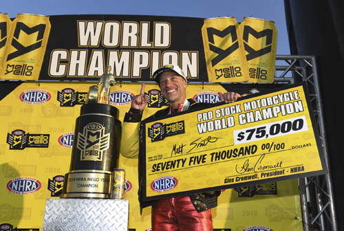 Matt Smith also won his third Pro Stock Motorcycle world championship at the final 2018 NHRA Mello Yello Drag Racing Series event during eliminations on Sunday. The race winners at Auto Club Raceway at Pomona were Steve Torrence (Top Fuel), Todd (Funny Car), Tanner Gray (Pro Stock) and M. Smith (Pro Stock Motorcycle). For the first time in NHRA history, all of the event winners were also the world champions in their respective categories.