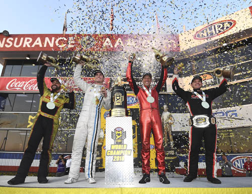 • Todd secured his first Funny Car career world championship during the opening round of eliminations • Matt Smith locked-in his third Pro Stock Motorcycle world championship and fourth event victory of the season • Torrence made history by sweeping the Top Fuel wins during the playoffs • Gray clinched his eighth Pro Stock win of the season