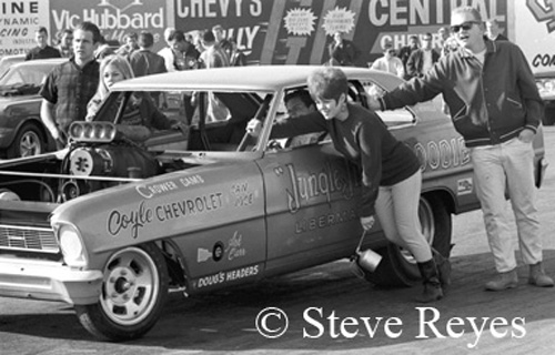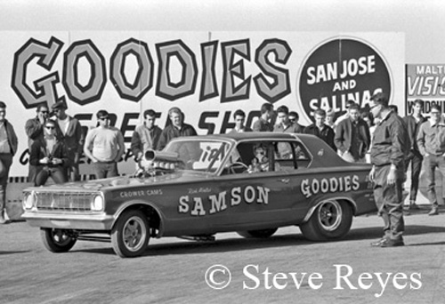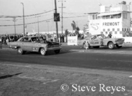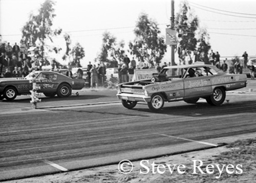 Although it was fifty-two years ago, it seems like yesterday, when in December 1966, my phone rang. On the other end was Super Stock photo director Leslie Lovett. The first words out of his mouth were, "Hey Kid, I hear you can shoot a pretty good photo." After picking my jaw off the floor I asked why he was calling me. Leslie told how Super Stock had a section in the magazine called "Match Race Madness." It featured high profile funny car match races from all over the USA and that he wanted me to cover the following weekend's match race between Jim Liberman and Gas Ronda at Fremont, California. Now I had been published before in Drag News, National Dragster, All American Drags and Drag Racing Magazine; but none of them ever called with an assignment and Super Stock Magazine became my first real assignment as a drag race photographer. Of course, I told Mr. Lovett yes, I would cover the match race for him. Heck, I didn't even discuss money. About all I did prior to the weekend was pray for no rain. It was Northern California in December and rain is very common through out the week and weekend that time of year. The weekend arrived on Sunday, December 18, 1966, and I got to photograph the Chevy vs. Ford match race under sunny but cool clear skies. Keeping in mind what Lovett had told me, I tried to shoot the event to his specs but I added my own touch to the coverage. After three rounds of head to head racing, I had my coverage and it was off to the dark room for film processing and printing to send ASAP to Super Stock. I received a follow-up call from Lovett thanking me for the great coverage and telling me that my photos would be in the March 1967 issue of Super Stock and yep, they were on page 56. Now, I was published in Super Stock and it was with Liberman's first big-time match race. What a way to begin an amazing career photographing drag racing! If you wish to purchase prints of the photos below or any others, they may be obtained by contacting us at breyes@reyesontour.com. Other photos for purchase may be viewed by following the links at www.reyesontour.com.
