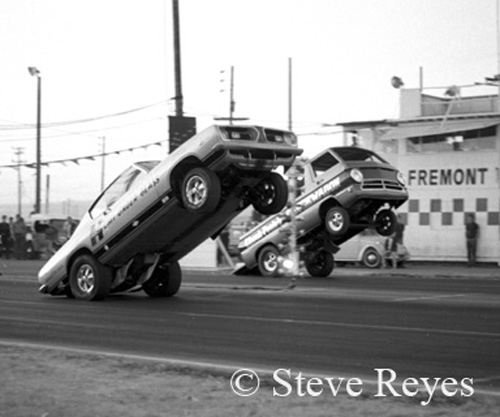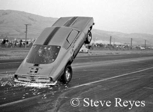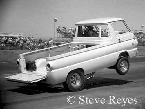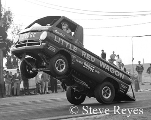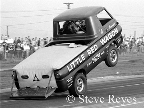 Drag racing seems to have given birth to some rather "different" race cars over its extended history of almost seventy years. The high-flying wheel standers were a real "one of a kind" class of racers. Deemed a circus act by serious racers, by mid-1960s they had established a huge fan base. Bill "Maverick" Golden and the Little Red Wagon started the class rolling and he never looked back. It sure sounds like Golden was the father of the wheel stander class but that was not so. In 1964 it was the brain storm of super stock racer Dick Branstner. Midway through 1964, Branstener stuffed an injected Hemi in the rear of a Dodge A-100 pickup to go racing. With the A/FX class exploding on the scene at drag strips nationwide, why did he not build an A/FX Dodge A-100? Well, they started out that way by reworking the A-100 to adapt it to take the 426 Hemi and race as a new A/FX. Jay Howell was chosen as the A-100's shakedown driver. Testing the pickup resulted in some mid-10 second trials but the race car was plagued by wheel stands. Branstner then fell out of favor with his Chrysler sponsor and was relieved from his duties on the project. The project was given to Chrysler super stock racer Bill "Maverick" Golden to finish. He took his newly inherited race car to California for winter testing. Golden tried different tires, fuel blends, and anything else that would keep the front end on the ground. While testing at Lions, "Maverick" let it all hang out with the Little Red Wagon and the result was seven straight tail dragging wheel stands. Feeling like a failure, "Maverick" towed back to the pit area only to be mobbed by the crowd at Lions. At that moment, Golden knew he had something special. The rest of the winter he worked on a brake system in which to control the 'wagon on its two-wheel journey down the 1320. He developed a complete guidance system of hand controls without the steering wheel. His system was independently functioning brakes very similar to the system used by aircraft pilots to turn an airplane on a taxi-pad. With the success of the Little Red Wagon, soon Hurst's Hemi-Under-Glass made the rounds of NHRA national events with another former super stock racer, Bill Shrewsberry at the controls. Then in 1966, Chuck Poole debuted his first Chuck Wagon Dodge bodied wheel stander. More wheel standing racers came on the scene and one of the strangest was Hollie Swingle's Back Up Pickup. Driver changes also took place with Bob Riggle taking over the Hurst Hemi-Under-Glass Cuda and Bill Shrewsberry going out on his own with his candy-striped LA Dart. This was only the early years in the class and it became a contest to see who could out do the other in wild and strange wheel standers. If you wish to purchase prints of the photos below or any others, they may be obtained by contacting us at breyes@reyesontour.com. Other photos for purchase may be viewed by following the links at www.reyesontour.com.