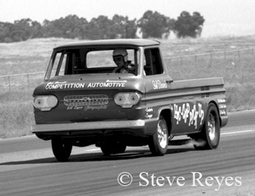 We were at Half Moon Bay, California, and the feature of the day was Hollie Swingle driving his Back Up Pickup. The fans at Half Moon Bay didn't know whether to cheer or boo this bizarre wheel stand act.