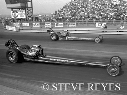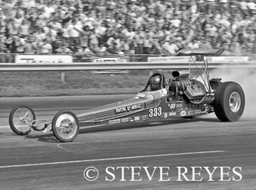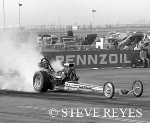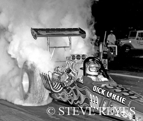 in Martin, Michigan. LaHaie ventured to the West Coast for the NHRA Supernationals at Ontario, California. If you look close at the burnout in Ontario, there is a guy sitting on a mini-bike (right side of the photo). It is Don Prudhomme checking out LaHaie and his Michigan-based AA/FD. LaHaie lost a close race to Wild Bill Alexander in Bill Wishart's AA/FD that long-ago weekend in 1971.
