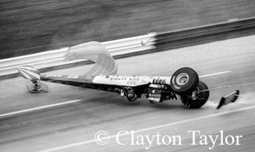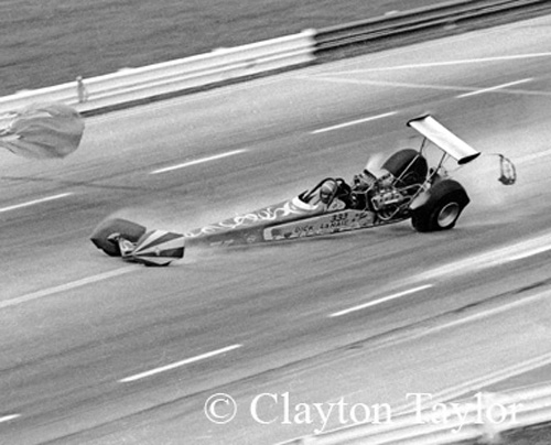 This one at Indy was captured by photographer Clayton Taylor. It was the second of two bad crashes for LaHaie. Taylor was right on the spot to shoot LaHaie's crash. The crash was caused by a left rear tire failure. When it looked like Dick was out of business, his old friend, M& H tire honcho Marv Rifchin wrote Dick a check to pay for a new top fuel car.