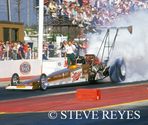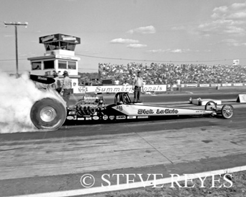 Top Fuel racing's quintessential "tough" guy has left us after a prolific career. The guy that could do it all in top fuel; build, tune and drive, passed away on December 5, 2018 at the age of seventy-six. The Michigan native won championships as a driver but also tuned Scott Kalitta and Larry Dixon to a combined four top fuel championships. LaHaie's road to success started at the early age of thirteen with a 1948 Mercury Coupe that he purchased with money he had saved up over a period of three years. It was followed by a few more door slammers and then in the early 1960s, Dick acquired his 1951 Henry J. The Henry J had a 476 Olds engine and it became a familiar fixture at Michigan drag strips. LaHaie's driving ability caught the eye of the Canfield and Johnson team who raced a well-known AA/MF roadster at local drag strips. That roadster became LaHaie's first nitro burning ride. Then in 1966, the Canfield and Johnson team debuted their new AA/FD with Dick LaHaie at the controls. After a very good year of racing, Canfield and Johnson decided to quit racing. Not having a ride was not a problem for LaHaie who had already made a name for himself and didn't mind doing his own thing. Dick soon joined the Midwest UDRA circuit of top fuel racing. In 1970, he won his first of three (1970, 1973, and 1976) UDRA Midwest top fuel championships. Being a hands-on kind of racer, he built every car he raced from the ground up at Wayne Farr's Chassis shop. Farr was truly a life-long best friend. Unfortunately, the racing season of 1975 was not a banner year for LaHaie. He replaced the car that started the year with a lighter slicker version. Then at the Gatornationals in Gainesville, Florida, the throttle stuck wide open as it was going down the track. The only way to slow the car down was to push the clutch in resulting in an exploding engine which caused the car to crash. Dick survived the crash but was left with a broken right arm and a severed left hand. As luck would have it a group of medically trained Vietnam Vets were in Gainesville teaching limb replacement and they helped reattach his left hand. During his rehabilitation, Jon Thomas, of the Thomas Brothers top fuel team, drove LaHaie's car on the Midwest UDRA circuit. By August of 1975, LaHaie was back in the cockpit of his top fuel dragster. However, fate soon stepped in again and almost ended his top fuel driving career. Dick had built a new car for the NHRA Nationals at Indy. The weekend before Indy, LaHaie ran and won top fuel at US30. His new ride was looking good for the nationals. Then on third qualifying run at Indy, the left rear inner liner of the tire failed on a 236 mph. pass. Needless to say, the car flipped upside down, hit the guard rail and he re-broke the right arm and lost three toes (two were re-attached). A month after the crash, a wounded but not defeated LaHaie, decided he still wanted to race. However, two major crashes had put a strain on the wallet. Old friend Marvin Rifchin stepped up and wrote Dick a check for a new top fuel car. That is a really good friend. Top Fuel racing's Ironman turned things around in the 1980s. At Englishtown, New Jersey, he won his first major NHRA top fuel race. He also won NHRA's Eastern Region top fuel championship. Dick started off 1982 with a top fuel win at the NHRA Winternationals in Pomona, California and that year also marked the beginning of Kim LaHaie as her Dad's full-time crew chief. She also became a top fuel license holder and drove in the top fuel class. The father-daughter team did well in 1985, winning the Gatornationals and many top fuel races in the Midwest. They raced in six top fuel finals in 1986 winning two of the races and ended the year third in the points. The 1987 season proved to be LaHaie's best season as a driver. The team of Minor, LaHaie, and Miller Brewery laid waste to the to fuel class that year. Kim LaHaie tuned her dad to five NHRA national wins in Miller/Minor backed top fuel car. The big prize was at the end of 1987 when the NHRA top fuel championship went home with Dick and Kim LaHaie. Between 1988 and 1991, the LaHaie's won five more NHRA races. After the 1991 season, LaHaie retired from the driver's seat and started tuning cars. A phone call from Connie Kalitta had LaHaie right back in the top fuel wars, NHRA style. Kalitta wanted a top-notch tuner for his son Scott and his old pal Dick LaHaie was the perfect choice. LaHaie made Scott into a top contender for a NHRA top fuel championship. In his first year as crew chief, Scott had a top fuel win in Topeka and a runner-up to Eddie Hill for the overall top fuel championship in 1993. For the following two years, Scott had the car to beat in NHRA top fuel racing. The team of Kalitta and LaHaie won back to back NHRA top fuel championships in 1994 and 1995. The duo just missed the championship in 1996. Before LaHaie retired in 2005, he tuned Don Prudhomme and Larry Dixon's Miller Lite top fuel car to back to back NHRA top fuel championships in 2002 and 2003. The LaHaie family of Dick, Claudia, and their kids, Kim and Jeff have left one heck of a legacy in the sport of drag racing. Top Fuel's "Ironman" may be gone but he won't be forgotten! If you wish to purchase prints of the photos below or any others, they may be obtained by contacting us at breyes@reyesontour.com. Other photos for purchase may be viewed by following the links at www.reyesontour.com.