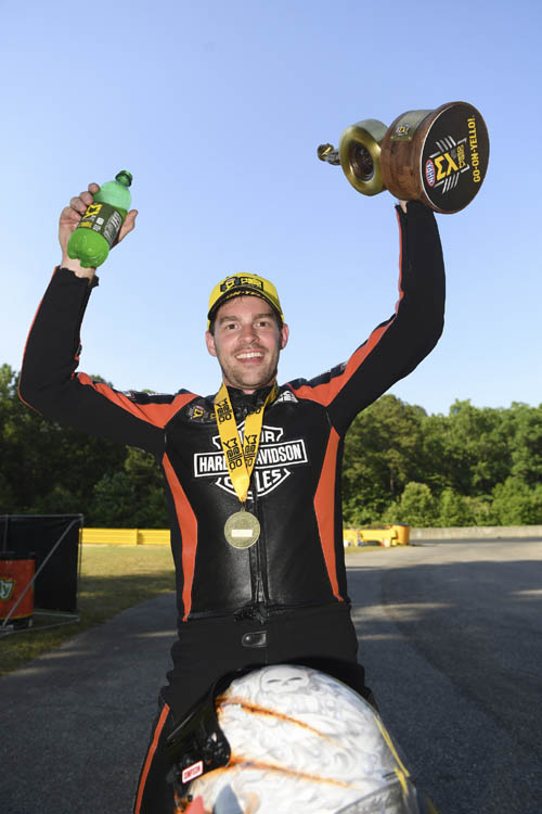 "We have developed a very good hot weather tune up for our Street Rods and that's saying a lot," Hines said. "We typically tend to not look forward to the middle of the season because that's where our performance tends to fall off and people make up ground on us. Today we were able to take what we've learned the last couple of weeks between Charlotte when it got hot and Atlanta when it was really hot. We don't ever go up there (the starting line) with the same tune up, ever. It was a little bit of picking on it here and there which has led to us finding the window where we need to be." The category points leader defeated Jiana Salinas, Ryan Oehler and defending world champion Matt Smith to reach the final round. Krawiec took down Kelly Clontz, Karen Stoffer and Hector Arana Jr. en route to his 25th final round against Hines. The NHRA Mello Yello Drag Racing Series continues to Chicago for the Route 66 NHRA Nationals at Route 66 Raceway May 30th - June 2nd. Sunday's final results from the Second annual Virginia NHRA Nationals at Virginia Motorsports Park. The race is the eighth of 24 in the NHRA Mello Yello Drag Racing Series- Top Fuel -- Steve Torrence, 3.881 seconds, 319.82 mph def. Antron Brown, 3.899 seconds, 309.49 mph. Funny Car -- Ron Capps, Dodge Charger, 4.097, 310.98 def. J.R. Todd, Toyota Camry, Broke. Pro Stock -- Bo Butner, Chevy Camaro, 6.599, 209.01 def. Greg Anderson, Camaro, 6.607, 210.18. Pro Stock Motorcycle -- Andrew Hines, Harley-Davidson, 6.845, 195.68 def. Eddie Krawiec, Harley-Davidson, 6.858, 196.44. Pro Modified -- Sidnei Frigo, Chevy Camaro, 5.796, 256.55 def. Steve Jackson, Camaro, 5.768, 251.16. Super Stock -- Joe Santangelo, Chevy Camaro, 10.250, 118.73 def. Steve Comella, Dodge Dart, 8.838, 146.19. Stock Eliminator -- Wallace Dent, Chevy Camaro, 10.624, 123.40 def. Joe Lisa, Camaro, 10.937, 118.20. Super Comp -- Chris Garretson, Dragster, 8.905, 133.38 def. Colby Fuller, Dragster, 8.914, 175.96. Super Gas -- Tom Goldman, Chevy Corvette, 9.909, 160.23 def. Michelle Furr, Corvette, 9.870, 159.72. Top Dragster presented by RacingRVs.com -- Chad Traylor, Dragster, 7.209, 180.26 def. Junior Houston, Dragster, 7.415, 172.08. Factory Stock Showdown -- Drew Skillman, Ford Mustang, 7.990, 170.69 def. Bo Butner, Mustang, 7.989, 171.29.