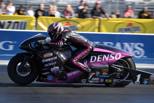 Defending Pro Stock Motorcycle world champ Smith set both ends of the track record on his Denso
