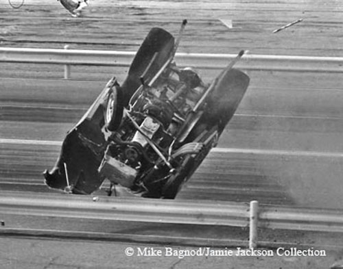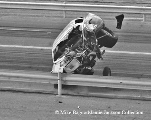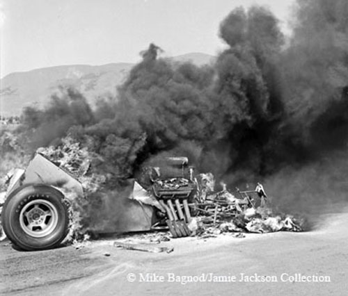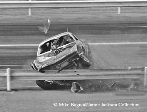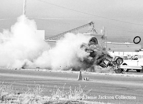 a photo pass. No problem for Mike, he just headed up to the spectator grandstand with his Nikon F motor drive. He caught some incredible images of the Herrera and Sons Opel destroying itself on the Pomona guardrail. Mike's photos appeared in Hot Rod and many other automotive magazines of that day.