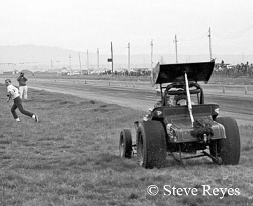 Willie missed Mike, but in 1973, Mike was almost hit by Sush Matsubara in the Pisano & Matsubara AA/FC. Again, he was standing way too close to the track at the finish line when the funny car Became a 200 mph lawnmower. After his near miss, Mike was lectured by Jamie Jackson and other photographers at Fremont about standing in the wrong areas to shoot photos.
