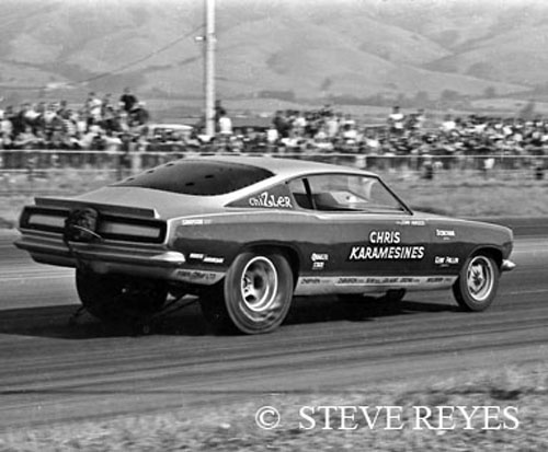 with a Ken Fuller chassis 'Cuda funny car. Longtime friend Cliff Zink drove for Karamesines. It was a short-term venture for the Greek as it only lasted one season. Karamesines went the funny car route briefly in the early 1970s with a Mustang flopper and then that car was sold to John Locus.