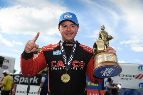 "We go out there and run the car and race the lane," Wilkerson said. "Capps has used me up the last 2-3 years. He's whooped me every time in the finals. We've got a good car, ran well in Brainerd and I was making sure I was going down the track today. In the finals, I ran it like it was a night run. My guys do such a terrific job and there's a lot of emotion in this. I'm really proud of them. This place and me, we've got a good relationship and it always treats me well." Capps defeated Justin Schreiber, Robert Hight and Alexis DeJoria to reach the final round for the fourth time this season and 129th time overall. With his strong showing, he jumped into the points lead heading into the playoffs, with Force in second.