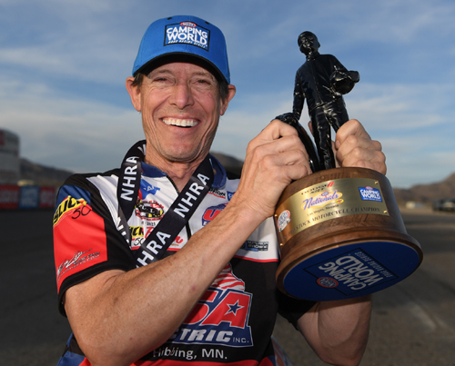 "It is very, very special to win this event, but it's really about the championship," Johnson said. "It took us 17 years to win our first national event and I'm a sucker for this sport. I really want to bring home a championship. I'd love to be a part of that championship fraternity and to be able to try to do it in our hometown is going to be really, really special." Stoffer reached the final round for the second straight race and 26th time in her career thanks to victories against Kelly Clontz, Jerry Savoie and M. Smith. Sampey also remains in championship contention, sitting 30 points behind Smith. The NHRA Camping World Drag Racing Series closes out the 2021 season on Nov. 11-14 with the Auto Club NHRA Finals at Auto Club Raceway at Pomona. Sunday's final results from the 21st Annual Dodge//SRT NHRA Nationals presented by Pennzoil at The Strip at Las Vegas Motor Speedway. The race is the 19th of 20 in the NHRA Camping World Drag Racing Series. Top Fuel -- Steve Torrence, 3.717 seconds, 329.50 mph def. Mike Salinas, 3.737 seconds, 314.24 mph. Funny Car -- Cruz Pedregon, Dodge Charger, 4.257, 225.03 def. Ron Capps, Charger, 6.854, 80.86. Pro Stock -- Dallas Glenn, Chevy Camaro, 6.660, 204.60 def. Erica Enders, Camaro, 6.684, 203.74. Pro Stock Motorcycle -- Steve Johnson, Suzuki, 6.869, 195.11 def. Karen Stoffer, Suzuki, Foul - Red Light. Top Alcohol Dragster -- Rachel Meyer, 5.191, 281.01 def. Jackie Fricke, 5.260, 270.16. Top Alcohol Funny Car -- Sean Bellemeur, Chevy Camaro, 5.535, 265.17 def. Brian Hough, Camaro, 5.973, 161.34. Competition Eliminator -- Bruno Massel, Cobalt, 7.099, 182.92 def. Dean Carter, Dragster, 6.994, 167.43. Super Stock -- Chris Hall, Chevy Camaro, 8.990, 150.46 def. Larry Zavala, Camaro, 9.899, 134.15. Stock Eliminator -- Justin Lamb, Chevy Camaro, 9.918, 131.14 def. Todd Hoven, Dodge Coronet, 9.986, 130.59. Super Comp -- Steve Williams, Dragster, 9.052, 184.57 def. Cody Webber, Dragster, 9.031, 177.65. Super Gas -- Evan Kowalski, Chevy Corvette, 10.038, 154.17 def. Mike Ferderer, Pontiac Grand Am, 10.034, 161.83. Super Street -- Nick Alejandre, Chevy Chevelle, 11.029, 139.17 def. Kenny Snow, Chevelle, 11.029, 142.19. Pro Modified -- Lyle Barnett, Chevy Camaro, 5.814, 253.56 def. JR Gray, Camaro, 5.796, 248.66. Factory Stock Showdown -- Aaron Stanfield, Chevy Camaro, 7.903, 173.49 def. Leah Pruett, Dodge Challenger, 7.944, 174.30. Summit Super Pro -- Nick Smith, KLRC, 7.256, 182.50 def. Joseph Bagwell, 7.943, 170.95. Summit Pro ET -- Dan Cassie, Mercury Capri, 9.460, 140.37 def. Brandon Schmall, Chevy Beretta, 9.530, 133.78. Summit Sportsman -- Derrick Jackson, Chevy El Camino, 12.182, 105.82 def. Gary Hairfield, Chevy Corvette, 12.213, 108.44. Summit ET Motorcycle -- Garreth Sheppeard, Suzuki Hayabusa, 8.221, 177.30 def. Erik Crosby, Kawasaki Ninja, 9.418, 139.40.
