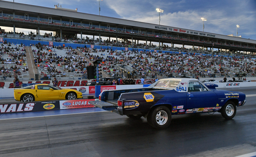 Derrick Jackson drove his brother's 1970 Chevy El Camino to the win. His normal race vehicle is a blue 1967 Dodge A100 pick-up truck sponsored by NAPA (it broke the weekend before the ET Finals). He drove the El Camino in the Sportsman class at the National Championship run off in 2006 in Pomona (Runner Up finish). My brother normally runs the El Camino in the Pro class.