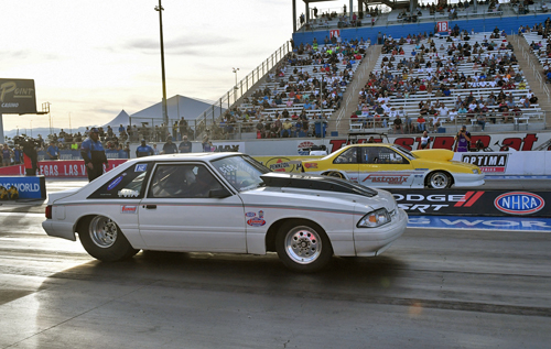 Dan Caissie and Megan Lincoln, he has only owned the 1980s Mercury Capri tube chassis car with a Nelson Belot engine and Gregoire transmission on M/T Pro Bracket Radials less than a year. It's still a footbrake car that runs low 9's close to 150 mph