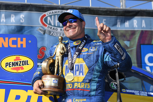 "I definitely attribute the position we're in to the consistency we've had all year," said Capps, who has 68 career wins. "We've been very consistent in qualifying and on raceday and it's been fun to navigate where we're at right now. This has been one of the most closely-matched years we've ever had in Funny Car, so it's definitely been an interesting year, but I've been through a lot of championship chases. It seems like it's going to come down to the last day of the last race to win a championship, so it's going to be exciting."