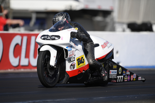 "The job is to turn on the win light and we want to do that four times tomorrow," Stoffer said. "We've got the bike to do it and that was a good pass. We nearly squeaked out that 200 (mph) run, but we're really excited. My job is to go ride the best I can and try to turn that win light on." Stoffer's run bumped Matt Smith to second, as the points leader and defending world champ went 6.778 at 201.25. Eddie Krawiec's 6.810 at 199.55 put him third, while championship contenders Steve Johnson and Angelle Sampey followed in fourth and fifth, respectively. Smith will take a 41-point lead over Sampey into raceday and faces Ryan Oehler in the first round. He could potentially face Sampey in the second round and Johnson, who is 45 points out of first, in the semifinals. Eliminations for the Auto Club NHRA Finals at Auto Club Raceway at Pomona begin at 10 a.m. PT on Sunday.