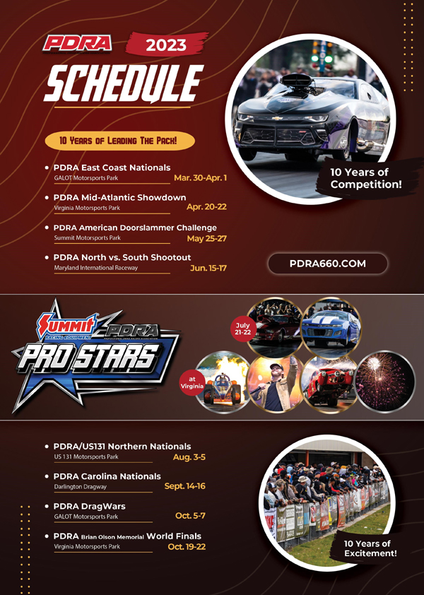 March 30-April 1 - East Coast Nationals - GALOT Motorsports Park - Benson, NC April 20-22 - Mid-Atlantic Showdown - Virginia Motorsports Park - Dinwiddie, VA May 25-27 - American Doorslammer Challenge - Summit Motorsports Park - Norwalk, OH June 15-17 - North vs. South Shootout - Maryland International Raceway - Budds Creek, MD July 21-22 - Summit Racing PDRA ProStars - Virginia Motorsports Park - Dinwiddie, VA Aug. 3-5 - PDRA/ US 131 Northern Nationals - US 131 Motorsports Park - Martin, MI Sept. 14-16 - Carolina Nationals - Darlington Dragway - Hartsville, SC Oct. 5-7 - DragWars - GALOT Motorsports Park - Benson, NC Oct. 19-22 - Brian Olson Memorial World Finals - Virginia Motorsports Park - Dinwiddie, VA