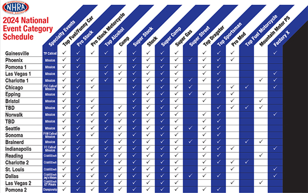PSM to race at 16 events; Callouts for all four classes; NHRA Pro Mod to debut in Phoenix; full schedule for Johnson's Horsepowered Garage Mountain Motor Pro Stock and Factory X presented by Holley INDIANAPOLIS - The NHRA has released the category schedule for all racing classes that will compete at NHRA Mission Foods Drag Racing Series events during the 2024 season. The 2024 season opens with the 55th annual NHRA Gatornationals, kicking off what will be the 73rd season of racing in the NHRA Mission Foods Drag Racing Series. Top Fuel, Funny Car and, as previously announced last week, Pro Stock will race at all 21 events. Pro Stock Motorcycle will compete at 16 events during the 2024 campaign, beginning with the category's traditional opener in Gainesville. Pro Stock Motorcycle will also race at the four-wide race in Charlotte and return to Chicago for the second straight year. After a successful debut 2023, Pro Stock Motorcycle will also return to Seattle, part of a stretch where the two-wheeled category will compete at six straight races beginning in Bristol and finishing in Sonoma. After a one-race break, Pro Stock Motorcycle will then return at Indy, finishing the season at the final seven events. All four professional categories will also race in all six events in the Countdown to the Championship playoffs. Callout races for all four classes will return next year as well, with the Pep Boys NHRA Top Fuel All-Star Callout taking place in Gainesville and the Pep Boys NHRA Funny Car All-Star Callout thrilling fans in Indy. The Pro Stock All-Star Callout will again happen in Chicago, with the Pro Stock Motorcycle All-Star Callout taking place for the second straight year in Sonoma. The Mission Foods #2Fast2Tasty NHRA Challenge will return in 2024, taking place at 14 regular-season events. The NHRA Pro Mod Drag Racing Series will open in Gainesville, the first of 10 events in the 2024 campaign. For the first time in class history, NHRA Pro Mod will race in Phoenix, thrilling fans at the "Duel in the Desert." From there, they will race in four consecutive races - Chicago, Epping, Bristol and the national event on June 21-23 - to close out its regular season. The four-race "Road to the Championship" playoffs will return in 2024 after a successful debut in 2023, with star drivers like world champion Mike Castellana will compete for a title at stops in Indianapolis, the fall race in Charlotte, St. Louis and the finale at the fall race in Las Vegas. After an impressive debut in 2023, the new NHRA Factory X presented by Holley category will see action at eight events next season, beginning its first full season in Gainesville. From there, the class will compete at the four-wide races in Las Vegas and Charlotte, Chicago, Norwalk, Indianapolis, St. Louis and the finale at the Texas Motorplex in Dallas. The fan-favorite Top Fuel Motorcycle class will thrill fans at four races in 2024, including Chicago, the NHRA national event on June 21-23, Brainerd and the fall race at zMAX Dragway in Charlotte. The Johnson's Horsepowered Garage Mountain Motor Pro Stock class, featuring exciting and powerful 800-plus cubic-inch engines, will compete at six events in 2023, starting at the Four-Wide event in Charlotte. Competitors in the eight-car field will race for a coveted Wally and in addition to an event purse, teams will also race for a world title for the first time in the class, with a champion being crowned at the end of the season. The other five stops for the class are Bristol, the following week, Brainerd, Reading and the fall race in Las Vegas. In the Lucas Oil Drag Racing Series, both Top Alcohol Funny Car and Top Alcohol Dragster will compete at 14 national events, with Top Dragster and Top Sportsman racing at 18 races apiece. Super Stock, Stock, Super Comp and Super Gas will be contested at all 21 national events, with Comp taking place at 17 races and Super Street taking part at seven events on the national scene in 2024.