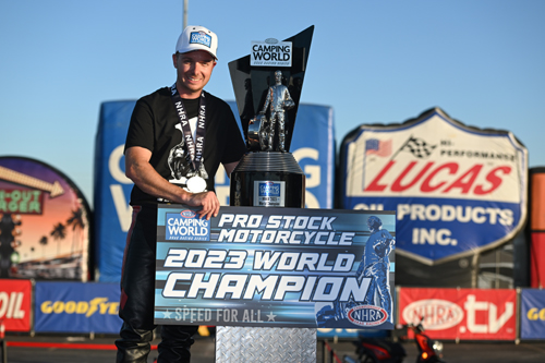 It is the finishing touch on one of the most incredible seasons in Pro Stock Motorcycle history, as Herrera dominated from start to finish. He won the first three races of the season, added another three-race winning streak during the year and then has won the last four races during the Countdown to the Championship. Add in a multitude of track records, the quickest run in class history and a sweep of the Western Swing and Herrera enjoyed a simply spectacular season. "This is very special, it doesn't feel real to be honest," Herrera said. "The amount of stuff we've accomplished this year and then wrapping it up getting the championship and then making a run like that the last qualifier, it's been an incredible season. I'm living the dream. Last year I was just out here trying to have a little fun and to get the opportunity to ride for the legends that I grew up watching race and looked up to, to be able to race with them and accomplish what we have, it's very surreal. "Wrapping up the championship here in my hometown, this is something I'll never forget, winning the championship in my first full season. There is a lot that has been accomplished this year, but this definitely tops it all. This is something I'll always cherish and remember. You never can take anything for granted. The bike has been flawless all year. We set a lot of records and it just goes on and on. It's crazy."