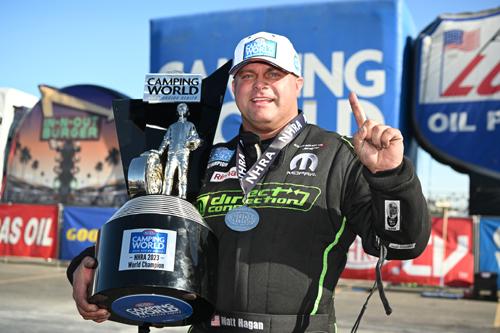 POMONA, Calif. - Top Fuel veteran Doug Kalitta claimed his first career NHRA world championship on Sunday at In-N-Out Burger Pomona Dragstrip, knocking off Leah Pruett in a winner-take-all final round, while Funny Car's Matt Hagan gave Tony Stewart Racing its first world championship at the 58th annual In-N-Out Burger NHRA Finals. Erica Enders (Pro Stock) also secured the championship on Sunday at the 21st race of the 2023 NHRA Camping World Drag Racing Series season, and the last of six races in the Countdown to the Championship playoffs. Gaige Herrera earned the Pro Stock Motorcycle world title on Saturday.