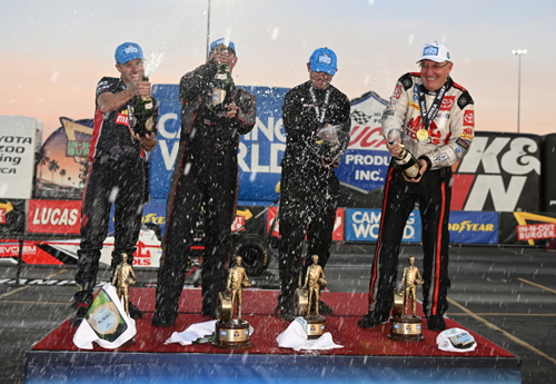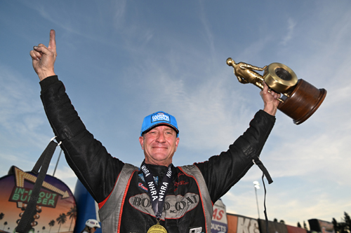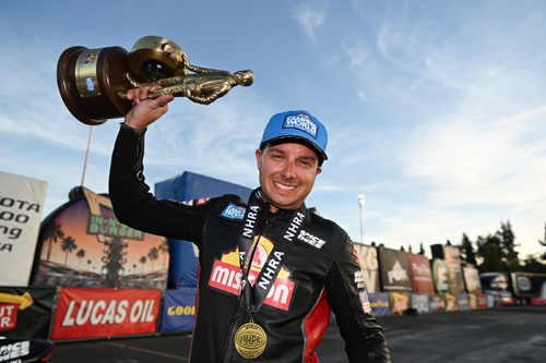 "This is very surreal. The whole championship thing, I have to give it up to the whole team, it's not only my championship, it's theirs - especially Andrew (Hines, crew chief)," Herrera said. "He works his butt off day and night to make sure my bike, Ed's bike, all the Vance & Hines bikes are fast. He texted me during the week and he's like, 'I'm ready to go to Pomona and just get this thing done. We had an incredible season, and I'm very excited.' Just to have someone like Andrew Hines text me and say it was one of his best seasons ever, even though he's not riding the bike, it's very cool to get that text message from someone like him. "I can't put this season into words. I don't think it's set in, what's been accomplished this year, and I think it's only the beginning. This season, I can't even put it into words. I didn't expect it to end like this this weekend." The 2024 NHRA Mission Foods Drag Racing Series begins March 7-10 with the NHRA Gatornationals at Gainesville Raceway. Sunday's final results from the 58th annual In-N-Out Burger NHRA Finals at In-N-Out Burger Pomona Dragstrip. The race is the final of 21 in the NHRA Camping World Drag Racing Series- Top Fuel -- Doug Kalitta, 3.673 seconds, 334.98 mph def. Leah Pruett, 3.720 seconds, 326.16 mph. Funny Car -- Chad Green, Ford Mustang, 3.916, 328.54 def. Tim Wilkerson, Mustang, 3.900, 327.59. Pro Stock -- Aaron Stanfield, Chevy Camaro, 6.534, 208.91 def. Matt Hartford, Camaro, 6.519, 210.14. Pro Stock Motorcycle -- Gaige Herrera, Suzuki, 6.721, 201.46 def. Eddie Krawiec, Suzuki, 6.796, 199.52. Top Alcohol Dragster -- Hunter Green, 5.193, 279.85 def. Kim Parker, 5.440, 261.88. Top Alcohol Funny Car -- Sean Bellemeur, Chevy Camaro, 5.454, 265.22 def. Shane Westerfield, Camaro, 8.997, 103.18. Competition Eliminator -- Ralph Van Paepeghem, Roadster, 7.369, 169.81 def. Brandon Huhtala, Pontiac GPX, 10.450, 89.46. Super Stock -- Wyatt Wagner, Chevy Camaro, 9.698, 117.92 def. Kyle Rizzoli, Chevy Cobalt, No Time Recorded. Stock Eliminator -- Leo Glasbrenner, Chevy Camaro, 9.581, 119.63 def. Clifton Hanson, Camaro, 10.856, 108.47. Super Comp -- John Labbous Jr., Dragster, 8.907, 163.95 def. Cooper Chun, Dragster, 8.899, 159.31. Super Gas -- Steve Williams, Chevy Corvette, 9.909, 167.59 def. Greg Ventura, Chevy Chevy II, 9.915, 151.85. Top Sportsman -- Bryan Warr, Chevy Camaro, 6.779, 203.52 def. Richard Okerman, Chevy Beretta, 7.054, 194.63. Top Dragster -- Grant Durie, Dragster, 6.543, 212.03 def. Alan Kenny, Dragster, 6.235, 201.13. Junior Dragster Shootout -- Kashen Frye, Halfscale, 7.923, 82.61 def. Katelyn Torres, Halfscale, 7.907, 78.87.