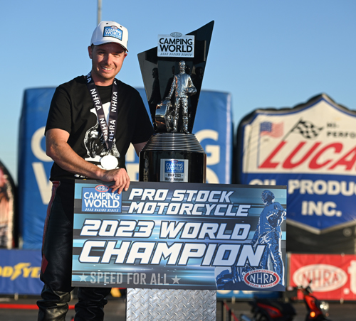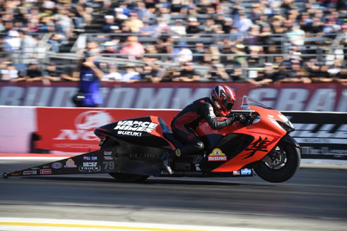 INDIANAPOLIS - NHRA Pro Stock Motorcycle rider Gaige Herrera simply dominated the field in the 2023 NHRA Camping World Drag Racing Series season. After winning a record-breaking 11 races, Herrera claimed his first world championship at In-N-Out Burger Pomona Dragstrip, finishing off one of the most incredible seasons in NHRA history. Herrera, rider of the Mission Foods Vance & Hines Suzuki, locked up his championship during qualifying at the In-N-Out Burger NHRA Finals in Pomona. He banked 14 of 15 No. 1 qualifier positions throughout the season, which set the all-time mark for a single season in the category.