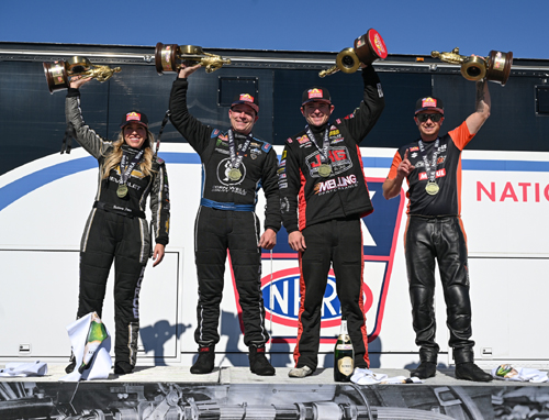 LAS VEGAS - Two-time Top Fuel world champion Brittany Force won for the first time in 39 races on Monday at The Strip at Las Vegas Motor Speedway, defeating reigning world champion Doug Kalitta in the final round of the 24th annual Ford Performance NHRA Nationals. Austin Prock (Funny Car), Aaron Stanfield (Pro Stock) and Gaige Herrera (Pro Stock Motorcycle) also won the 19th of 20 races during the 2024 NHRA Mission Foods Drag Racing Series season and the fifth of six races in the Countdown to the Championship playoffs.