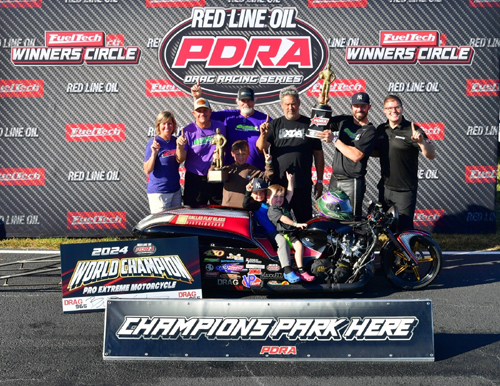 Grothus also went on to thank his family-based team and those that support the Grothus Dragbikes team. "I really have to thank my dad [Ed], Dan Wagner with DTM, and Tom Klemme with Klemme Performance Motorcycle," Grothus said. "He put the spare motor together and we had to have it. We hurt the other motor [Saturday] after we won the first round, and if we didn't get that motor back together, then we're not standing here right now. Big thanks also to my brother [Bradley] and my wife, Madeline. There's so many people involved, but those are some of the big ones." Garner-Jones, a perennial top two finisher, ended up second with runner-up finishes at four of the five events. He also qualified No. 1 once on his nitrous-fed T.T. Jones Racing Hayabusa. Brayden Davis, the 2023 Pro Jr. Dragster world champion, finished third with one win and one No. 1 qualifier aboard the Davis family's nitrous-assisted Timblin Chassis Hayabusa. The Red Line Oil PDRA Drag Racing Series will celebrate its 2024 world champions at the annual PDRA Championship Awards Banquet on Friday, Dec. 13 in downtown Indianapolis.