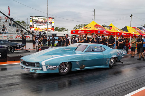 Mark Micke, who qualified No. 1 at the Drag Illustrated World Series of Pro Mod at Bradenton in March, rolled into the Snowbirds on a mission with his twin-turbocharged M&M Transmission '69 Camaro. Determined to set low E.T. of every round, Micke got off to a strong start on Friday as he was the quickest driver in both qualifying sessions. He held off six-time NHRA Pro Stock world champion Erica Enders and her 3.628 in the first session with his 3.625 at 217.21, then went quicker than Canadian Pro Mod veteran Kenny Lang's 3.624 with a 3.591 at 218.87 to reclaim the provisional top spot in the second session. "We were trying to run a little faster [in Q1] but the car shook a little early," Micke said. "Luckily this car recovered and we got lucky to beat Erica by just a little bit. We came back, looked at everything, the guys went to work, made a stator change in the converter, and changed some stuff on the car. I honestly thought everybody else was gonna step up a bunch, so when Kenny went that number, I'm like, 'All right, I've got a bunch of fast-ass cars behind me. We need to go .59-.60 to hold on to No. 1.' I really felt that. Luckily the car made the rip and did what we wanted it to. I think everybody else is struggling a little bit with the bald spots up there a little bit. We just got a hold of it." Micke intends to get an even better grip during Saturday's two qualifying sessions, which will set the 32-car field for Sunday eliminations. "This is Pro Mod so you can't slack up," Micke said. "Our mindset this weekend is we want to win this deal, period. We're going to win. We're not here to do anything else. Our goal coming in here was to run low E.T. every round and just try to put our foot on the throat of everybody else and just keep holding down and just keep going. That's what we're gonna do and we're not gonna slack off. We're not gonna lay up. Tomorrow, we're gonna try and go .58 during the day and if we get an opportunity, you might see a .56 or .57." Micke knows he'll need to continue chipping away into the 3.50s to hold on to his top spot. The group of drivers under him on the qualifying sheet include numerous world champions in various classes, including Enders, Stevie "Fast" Jackson, Jason Harris, and even four-time NHRA Top Fuel world champion Antron Brown making his Pro Mod debut. Some of the most accomplished tuners and crew chiefs in the sport are contributing to one of the most competitive fields in Pro Mod history. "You're gonna see other guys step up tomorrow, I promise, because the air is gonna cool off," Micke said. "When it cools off, the track gets better and everybody will step up. I think you'll see a number of cars in the 3.60 flat range. My guess is a bump spot of 3.63 if the air comes in like it's looking like it's going to be. There's no ducks here." Lang jumped to the No. 2 spot in the second qualifying session with his 3.624 at 209.17 in his screw-blown '69 Camaro. Enders, making her return to Pro Mod, laid down a 3.628 at 205.22 in Scott Tidwell's ProCharged Elite Motorsports '69 Camaro to end the day in the third spot. Two-time and reigning PDRA Pro Boost world champion Jason Harris drove his ProCharged Southern Diamond Company "Party Time" '69 Camaro to a 3.633 at 207.05 to sit fourth. Jeff Rudolf rounded out the top five with a 3.639 at 205.29 in his ProCharged "Ghetto Sleigh" '69 Camaro. Below Micke, it's an all-3.60-second field. Joel Wensley sits on the bump spot of the 32-car qualified field with his 3.680 at 206.26