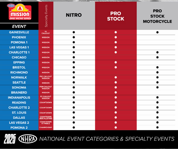 INDIANAPOLIS - NHRA announced today the 2025 schedule for the Pro Stock and Pro Stock Motorcycle categories in the Mission Foods Drag Racing Series, including the dates for the GETTRX NHRA All-Star Callout in both categories. The talent-heavy Pro Stock category will compete at 18 races during the 2025 campaign, racing at every event on the NHRA national tour except for Chicago and Richmond. The 74th season of the NHRA Mission Foods Drag Racing Series opens with the 55th annual NHRA Gatornationals on March 6-9 at legendary Gainesville Raceway, the first of 20 races next year. Top Fuel and Funny Car will compete at all 20 events, while Pro Stock will race at 18 events and Pro Stock Motorcycle will be contested at 15 races. After taking place in Chicago the previous two seasons, the GETTRX Pro Stock All-Star Callout will also get a new destination in 2025, as the fan-favorite one-day specialty race will take place as part of the Summit Racing Equipment NHRA Nationals on Saturday, June 28 at Summit Motorsports Park in Norwalk, Ohio. Greg Anderson is the defending winner of the Callout, while Anderson also enters the 2025 season as the reigning world champion, clinching his sixth world championship in a winner-take-all final round against KB Titan Racing teammate Dallas Glenn at the finale in Pomona. Pro Stock Motorcycle will compete at 15 events during the 2025 campaign, beginning with the category's traditional opener in Gainesville. Pro Stock Motorcycle will also race at the four-wide race in Charlotte and return to Chicago for the third straight year. Following a busy June that includes races in Bristol, Richmond and Norwalk, the class will again compete in Seattle, where the class raced for the first time in 2023, and Sonoma. The GETTRX Pro Stock Motorcycle Callout will also take place at the Denso NHRA Sonoma Nationals on Saturday, July 27, as Matt Smith will look to repeat his specialty race win. After a one-race break, Pro Stock Motorcycle will then return at Indy, finishing the season at the final seven events. Gaige Herrera won the championship in the two-wheeled category for a second straight year, picking up 10 event wins along the way. All four professional categories will also race in all six events in the Countdown to the Championship playoffs. Callout races will take place in Top Fuel and Funny Car as well, with the Top Fuel All-Star Callout taking place in Gainesville and the Funny Car All-Star Callout thrilling fans at the prestigious Cornwell Quality Tools NHRA U.S. Nationals in Indy. The popular Mission Foods #2Fast2Tasty NHRA Challenge, which brings competitive racing, a bonus purse and bonus championship points to Saturday qualifying, will return in 2025 as well, taking place at 13 regular-season events, including four-wide races at Las Vegas and Charlotte.