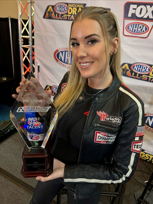 INDIANAPOLIS - NHRA newbie Ida Zetterström was named 'Best New Talent' by NHRA's National Dragster publication at the Performance Racing Industry (PRI) show in Indianapolis, it was announced on Thursday, December 12. The 2023 FIA European Top Fuel champion hailing from Sweden launched her NHRA career at the 2024 Brainerd Nationals in Brainerd, Minn. where she captured her first round-win at her debut event on U.S. soil by defeating a multi-time world champion on a holeshot to advance to the semifinals. Zetterström then went on to qualify for each of the remaining seven events on the NHRA Mission Foods Series schedule as she pursued NHRA's Rookie of the Year award. Despite only running a campaign of eight races out of the 20-event season, Zetterström's dedication, steadfast work ethic, and passion for the sport were evident and earned the attention of NHRA's fanbase who selected Zetterström for the Best New Talent award. "We were really gunning hard for NHRA's Rookie of the Year honors, and although we were disappointed not to have won that award, it wasn't quite a huge shock to us as we only competed in eight races while the majority of the contenders raced a full season, so we started with the deck stacked against us," explained Zetterström, driver of the JCM Racing VP Racing Fuels/Edelbrock/COMP Cams/Dodge Top Fuel dragster. "So, to win this title, Best New Talent, it is especially gratifying because this one was strictly voted on by the fans, and at the end of the day, the fans are what drives this sport. They're the reason we're all out here, racing for trophies and doing what we love." Zetterström out-earned fellow NHRA Rookie of the Year contenders Richard Gadson, Jasmine Salinas, 2024 Road to the Future award winner Tony Stewart, and Daniel Wilkerson in the voting process. "Like so much of what we do out here, I truly consider this award to be a team effort," added Zetterström, who relocated from Europe to the Indianapolis area in January to be close to the JCM Racing shop in Brownsburg. "I talked in my interview when I received the award about the relentless work that went into building this team and putting this operation together in order to be on the track by August, and how long this has been a great dream of mine to come over to NHRA and race, and how hard (crew chief) Jon Schaffer has worked to build up this team, and for Joe Maynard to make the decision to trust me to come drive his second race car. There was so much that went into us being able to run a rookie campaign this season, and it's nice to know that all of that hard work did not go unnoticed. "I ended the season feeling like we might not have had enough time to show what we can do and what we're capable of but seeing that the fans caught on and saw us on track and thought that we made an impression really does mean a lot to me and our whole team. I can't wait for even greater things in 2025 and am looking forward to securing the necessary funding required to compete in a full season."