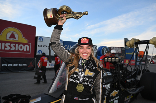 LAS VEGAS – In her final appearance at The Strip at Las Vegas Motor Speedway, Brittany Force powered past Shawn Langdon in the final round on Sunday at the 25th annual Dodge NHRA Nevada Nationals powered by Direct Connection, winning for the 19th time in her career. Matt Hagan (Funny Car), Dallas Glenn (Pro Stock) and Gaige Herrera (Pro Stock Motorcycle) also won the 19th of 20 races during the 2025 NHRA Mission Foods Drag Racing Series season and the fifth of six races in the Countdown to the Championship playoffs.