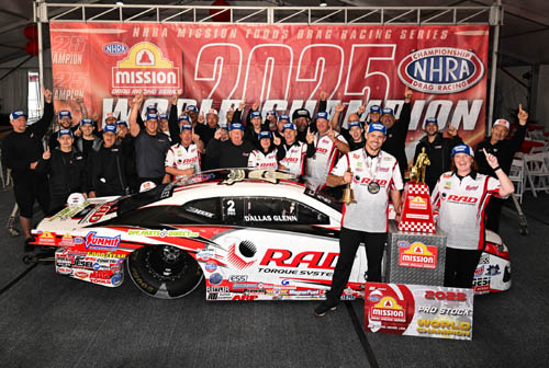 INDIANAPOLIS - For the past two seasons, In-N-Out Burger Pomona Dragstrip has been a location Pro Stock's Dallas Glenn will never forget. The 2024 race saw Glenn come up a mere .002-seconds short to his KB Titan Racing teammate and six-time world champ Greg Anderson, but 2025 proved to be the culmination of his redemption story, clinching his first world championship in Pomona after yet another hard-fought battle with Anderson throughout the year. This time, Glenn and his RAD Torque Systems Camaro made certain the championship was headed home to him. He was dominant all season and especially when it counted, earning eight overall wins, with four coming in the Countdown to the Championship playoffs as he kept Anderson at bay and put the finishing touches on a magnificent season.