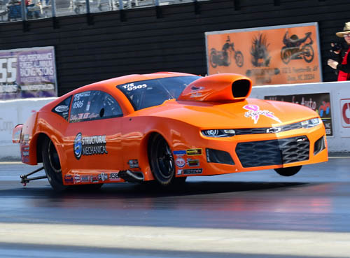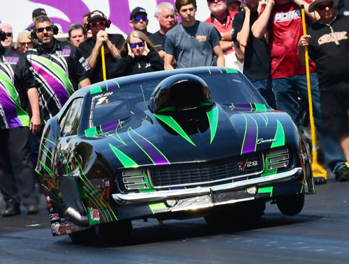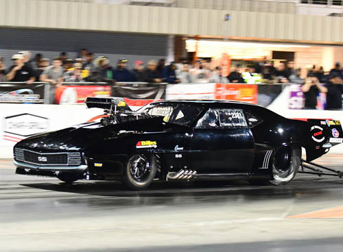 Past Pro Extreme world champion Jason Scruggs made a memorable return to the PDRA's quickest and fastest class when he fired off a 3.521-second blast at 219.83 mph in Roger Henson's '69 Camaro. The screw-blown entry suffered some damage when it went into the sand trap after the run, though the Saltillo, Mississippi-based driver and his team, led by his father, Mitchell, are making the necessary repairs to return for eliminations on Sunday. Sweden's Adam Flamholc took the No. 2 spot with a 3.648 at 211.03 in his screw-blown '63 Corvette, followed by local favorite Terry Leggett and his Leggett Logging & Trucking '71 Mustang with a 3.694 at 207.91.