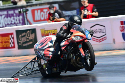 Terry Schweigert, a perennial favorite in the PDRA's two-wheeled class, qualified his Canadian Suzuki atop a strong 16-bike field with a best of 4.029 at 173.67. He faces Ricardo Knights in the opening round. "This is a good way to start the year, especially with the two turbo bikes out here," Schweigert said, referencing an offseason rule change to allow turbocharged entries in the class for the first time. "To run that pass at the end of the day feels good. It's a nice way to end the day and go into eliminations from the top spot." Drag bike chassis builder Brunson Grothus rode his Indocil Art '14 Suzuki to a 4.048 at 173.74 to take the No. 2 spot and take on George Whitaker on Sunday. Ronnie Smith is the No. 3 qualifier with his 4.049 at 171.25 and will face John Davis Jr.