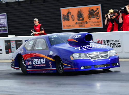 Jeff Dobbins made it known that he was serious about becoming the first Extreme Pro Stock driver to break into the 3-second zone when he posted a 4.00 in pre-race testing on Wednesday. Dobbins and his Bear's Performance '14 Dodge Avenger were the closest to the historic mark in qualifying with a 4.058 at 178.54, though the Liberty's Gears 3-Second Club is still awaiting its first member going into race day. "I like to think we're going into race mode," Dobbins said, "but our team is going to race as fast as we can every run. We're not going to go out and lay up. We're going to do the best we can. If the track will hold it, I don't see a 3-second run being a problem. You'll see a 3-second run on Sunday because the weather will be cool and hopefully the rain will clean the track." Dobbins will go head-to-head against Chris Powers in the Liberty's Gears '14 Camaro in round one of eliminations on Sunday. Past world champion John Pluchino qualified second after a 4.06 at 178.80 in his Commack, New York-based '13 Mustang and faces Elijah Morton, while North Carolinian Steven Boone ranked third with a 4.065 at 178.24 and races John DeFlorian Jr.