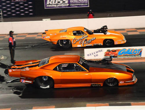 Jay Cox and his Buck-powered "Pumpkin" '69 Camaro made a strong opening statement in the Flatout Gaskets Nitrous Wars when the local favorite uncorked three of the quickest passes in Pro Nitrous history to win the East Coast Spring Nationals. In the final round against Jason Harris and the "Party Time" '69 Camaro, Cox left the starting line first and maintained his lead through the finish line, posting a 3.696 at 201.31 mph to beat Harris's 3.74 at 201.07. "We've got a really good motor right now," Cox said. "Me and (engine builder) Charlie Buck worked really hard on this piece. He thrashed day and night last year to get it to me early so I could put a few passes on it. We made some changes over the winter, made some more changes after the Mad Mule race here in March, and today you see the results." Cox's trip to the winner's circle started from the No. 2 spot. Through eliminations, he posted an unopposed 3.702 at 201.58 and a 3.677 at 202.09 over Danny Sauro before using a holeshot advantage and 3.664 at 202.52 to take down Lizzy Musi's 3.658 at 204.98 in the semifinals. Harris qualified in the No. 12 spot and defeated Jim Halsey, Matt Guenther and two-time and defending world champion Tommy Franklin before facing Cox in the final round.