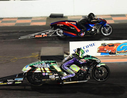Pro Extreme Motorcycle rookie Rodney Williford came out of the gate swinging came out of the gate swinging as he rode his nitrous-assisted Williford Racing '04 Suzuki Hayabusa to a 4.063 at 177.23 in the final round over multi-time PDRA event winner Brunson Grothus and his troubled 7.50 at 57.93. Williford, a star in the Pro Street scene, had never raced a motorcycle with wheelie bars or a big tire before a prerace test session. "It's been a crazy week," Williford said. "I told Ehren (Litten, teammate) he was crazy when he said we're going to race a turbo bike and a nitrous bike, but it all worked out in the end. It's like a dream come true. The moon and the stars aligned and we came out with a win at the end of the night. I couldn't be happier." Williford qualified No. 5 in the 16-motorcycle field and charged to 4.0-second passes over Burke Forster, Tommy Saxon and Terry Schweigert. Grothus qualified No. 2 aboard his Indocil Art Hayabusa and was unopposed in the first round before recording a pair of 4.02s to take down defending world champion Travis Davis and Ronnie Smith.