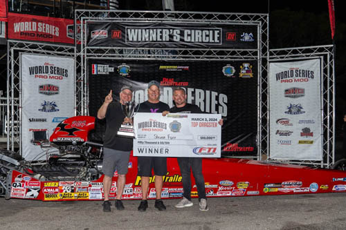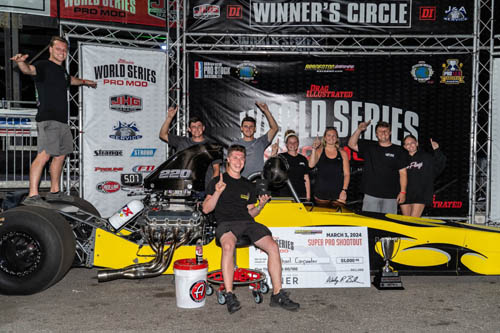 After a 40-minute delay, Ward was once again ready to get into the fight and both cars started and rolled through the water box. The excitement and tension on the starting line was palpable and Ward took a starting line advantage when the tree activated and he never trailed in the race. Looking back at the delayed start and then the eventual race win, Ward was happy but also thankful to Halsey. "It was stressful up until we got it started in the burnout box for the last final," said Ward. "You have to forget everything when stuff like that happens. I have to say thanks to Jim Halsey for giving me time to do what I had to do to get up the start line. I don't even pay attention to all that stuff when it is happening. I'm looking at the tree and down track. That's it. I wasn't thinking anything until we got that win light on the finish line." With a $100,000 payday in his pocket, Ward is looking forward to a busy 2024 Pro Mod season. The young driver does not have major plans for his winnings. "We are going to just keep working hard and keep going racing and see what happens," said Ward. For Halsey, the 2024 season is off to a bittersweet start. He was breaking in a new car, and it obviously showed promise winning four rounds on race day against some of the quickest teams in the class. Not getting a fifth win light might take some time to get over. "This was the first race on a brand-new car so we're very happy with it. Jerry Bickel builds a bad ass racecar," said Halsey. "I am just looking forward to the season and I am very excited about what it can do the rest of the road. I don't know about getting more luck. You know, sometimes nice guys finish last. Derek is a good guy, and he runs good. He deserves to win just as much as we do." The race day was stacked with quick runs and quality side-by-side racing for both finalists. In the quarterfinals, Halsey and his '68 Camaro took out reigning PDRA Pro Boost champion Jason Harris in a 3.652 at 208.33 to 3.684 at 205.35 race. Ward drove his G-Force Race Cars-built, screw-blown '68 Firebird to a holeshot win with a 3.673 at 206.45 over Marcus Butner's 3.667 at 207.40. Stevie "Fast" Jackson defeated Randy Weatherford, and Todd Tutterow took out Preston Tanner to reach the final four of the World Series of Pro Mod. Halsey (.027) 3.635, 208.71 trailered Tutterow (.057) 3.632, 205.57 on holeshot, and Ward's 3.639 at 207.85 defeated a red-lighting Jackson (-.070), 5.823 at 79.83 to reach the final round.