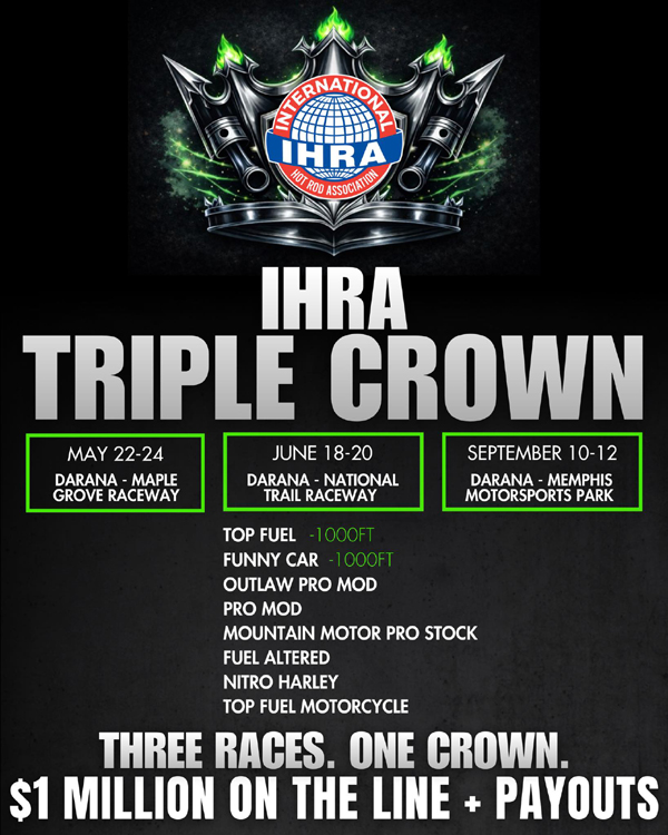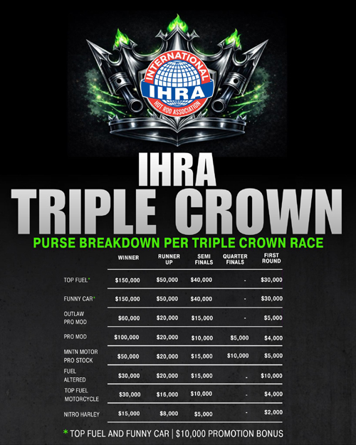 IHRA Triple Crown will have a $4,362,000 event payout across the three races. Triple Crown races will pay $150,000 to win in the Top Fuel and Funny Car divisions. A $1 million bonus will be paid to any competitor who captures all three Triple Crown races.