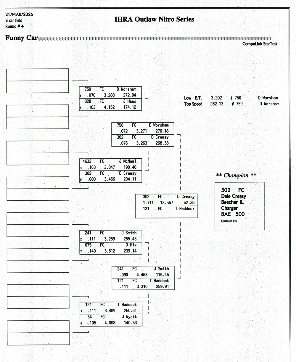BENSON, N.C. - Final eliminations ladder in Funny Car at the Outlaw Nitro Series, event at Darana Motorsports Park.