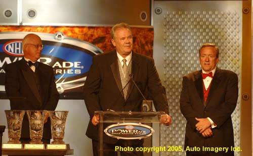 Ken Black accepts the Pro Stock Owners Championship cup as Don Schumacher waits in the wings to accept the cups for his Top Fuel and Funny Car championships.