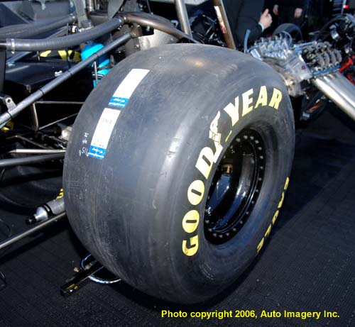 This is the new Goodyear tire that all Top Fuel and Funny Car teams will be required to run at the Winternationals. As you can see, they are very rounded with virtually no shoulder.