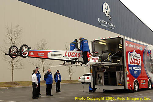 Lucas Top Fuel Team unload the dragster at Colts training camp.