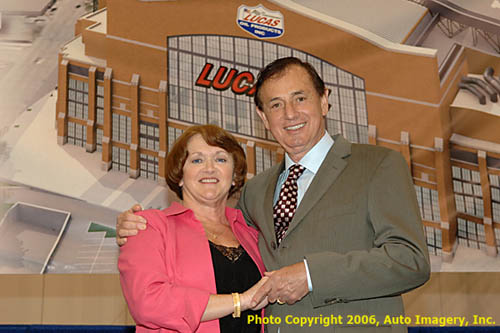 Charlotte and Forrest Lucas in front of the rendering of the new Lucas Oil Stadium in downtown Indianapolis.